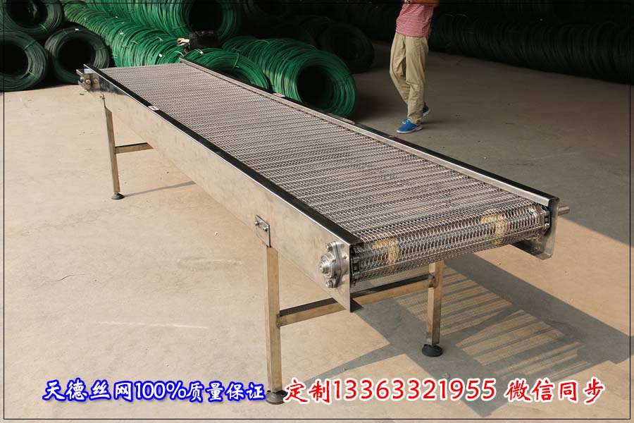 網帶輸送機是輸送行業必不可少的輸送設備,昨天桂林的袁總來電咨詢不銹鋼網帶輸送機,用來輸送小食品,我公司根據袁總提供的相關資料定制 具體數據如下:規定在食品行業我們采用不銹鋼304材質,機器的總寬在700毫米,總長度在5米,要求輸送機不帶腿,鏈條不銹鋼網帶 鏈節距為31.75毫米,不銹鋼桿直徑為8毫米,鏈桿之間的距離為200毫米,不銹鋼絲直徑為1.5毫米,網帶節距為30毫米,網帶螺距為20毫米, 配帶0.75千瓦電機,帶減速機和變頻器,要求速度比為1:50。控制開關要求正反均可調節。 網帶輸送機的用途特別廣泛,不銹鋼網帶是輸送機中重要的配件,可以根據輸送產品的形狀大小加工成不同規格結構的網帶。 不銹鋼輸送機整機堅固耐用,不愛生銹,使用壽命長,已經廣泛的應用在解凍流水線輸送設備中。