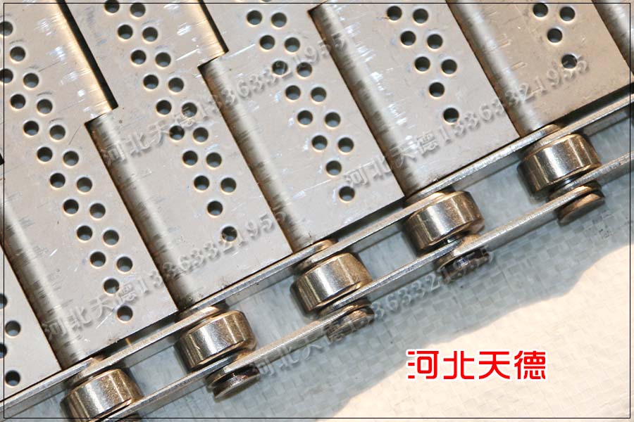 不銹鋼金屬板帶的長度為38米,輸送面積為1.2米,每米的載重為20千克,鏈板的厚度為1.5毫米,鏈條節距為50.8毫米,鏈桿直徑為10毫米,兩側擋邊高度為3公分,擋邊的厚度為1.5毫米,不銹鋼鏈板提升刮板高度為5公分,提升刮板之間的距離為200毫米左右,鏈板表面打孔直徑為3毫米,整條輸送帶采用不銹鋼304材質。