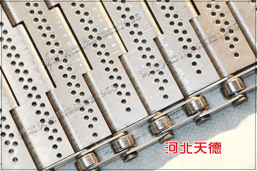 鏈板采用厚度1.5毫米鋼板折彎而成,鏈條節(jié)距為50.8毫米,鏈條的節(jié)距與鏈板的節(jié)距相同,用10毫米的鋼桿鏈接使用。